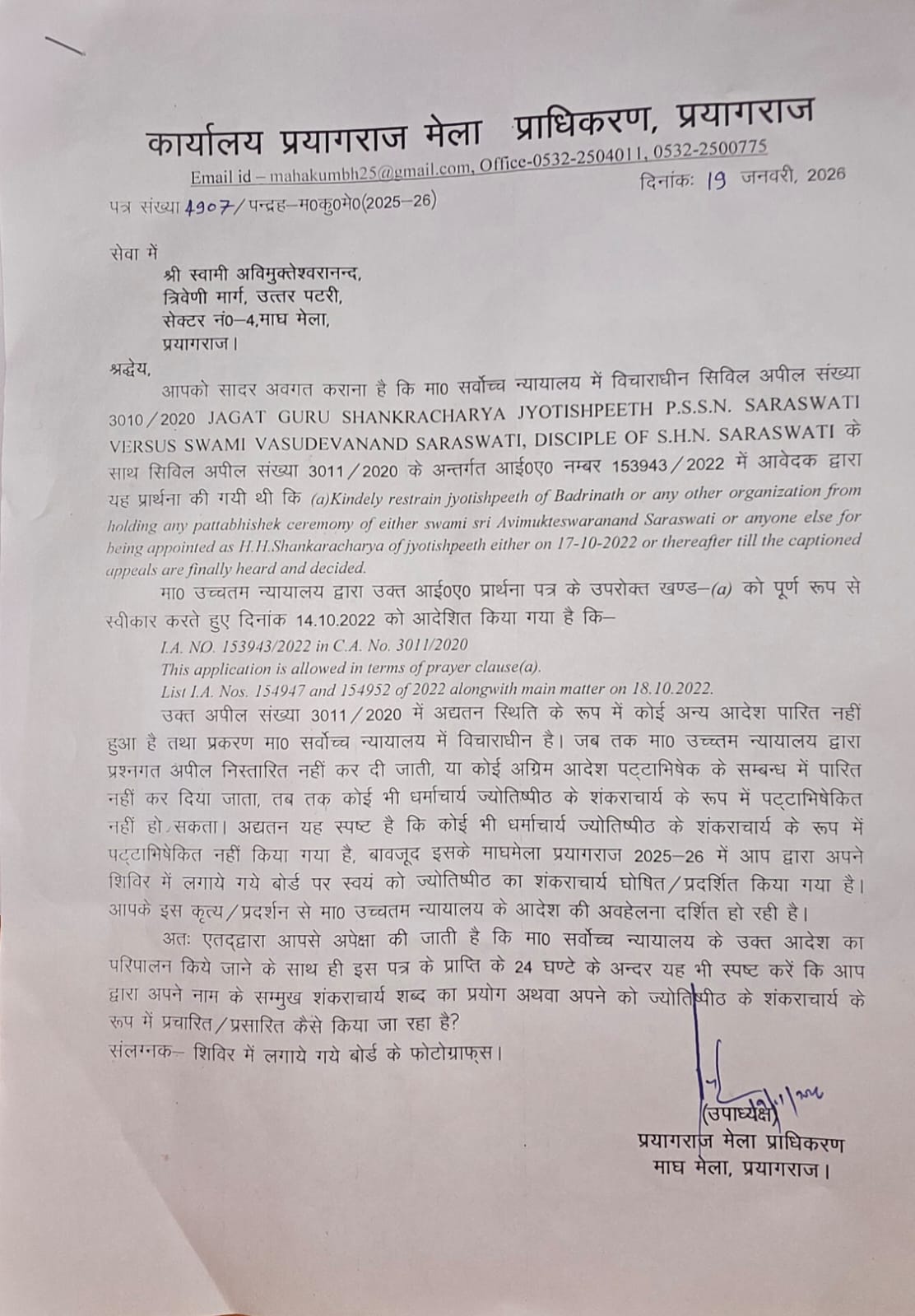 प्रयागराज। मौनी अमावस्या पर ज्योतिष पीठ के शंकराचार्य स्वामी अविमुक्तेश्वरानंद सरस्वती को रोके जाने का मामला, स्वामी अविमुक्तेश्वरानंद सरस्वती अभी भी अपने शिविर के बाहर पालकी पर बैठे हुए हैं, इस बीच देर रात प्रयागराज मेला प्राधिकरण ने स्वामी अविमुक्तेश्वरानंद को एक पत्र जारी कर दिया है, नोटिस जारी कर स्वामी अविमुक्तेश्वरानंद से 24 घंटे में जवाब मांगा गया है पत्र में सुप्रीम कोर्ट में विचाराधीन ब्रह्मलीन ज्योतिष पीठ के शंकराचार्य स्वामी स्वरूपानंद सरस्वती और स्वामी वासुदेवानंद सरस्वती के लंबित मुकदमे का जिक्र किया गया है यह पत्र प्रयागराज मेला प्राधिकरण के उपाध्यक्ष की ओर से जारी किया गया है।