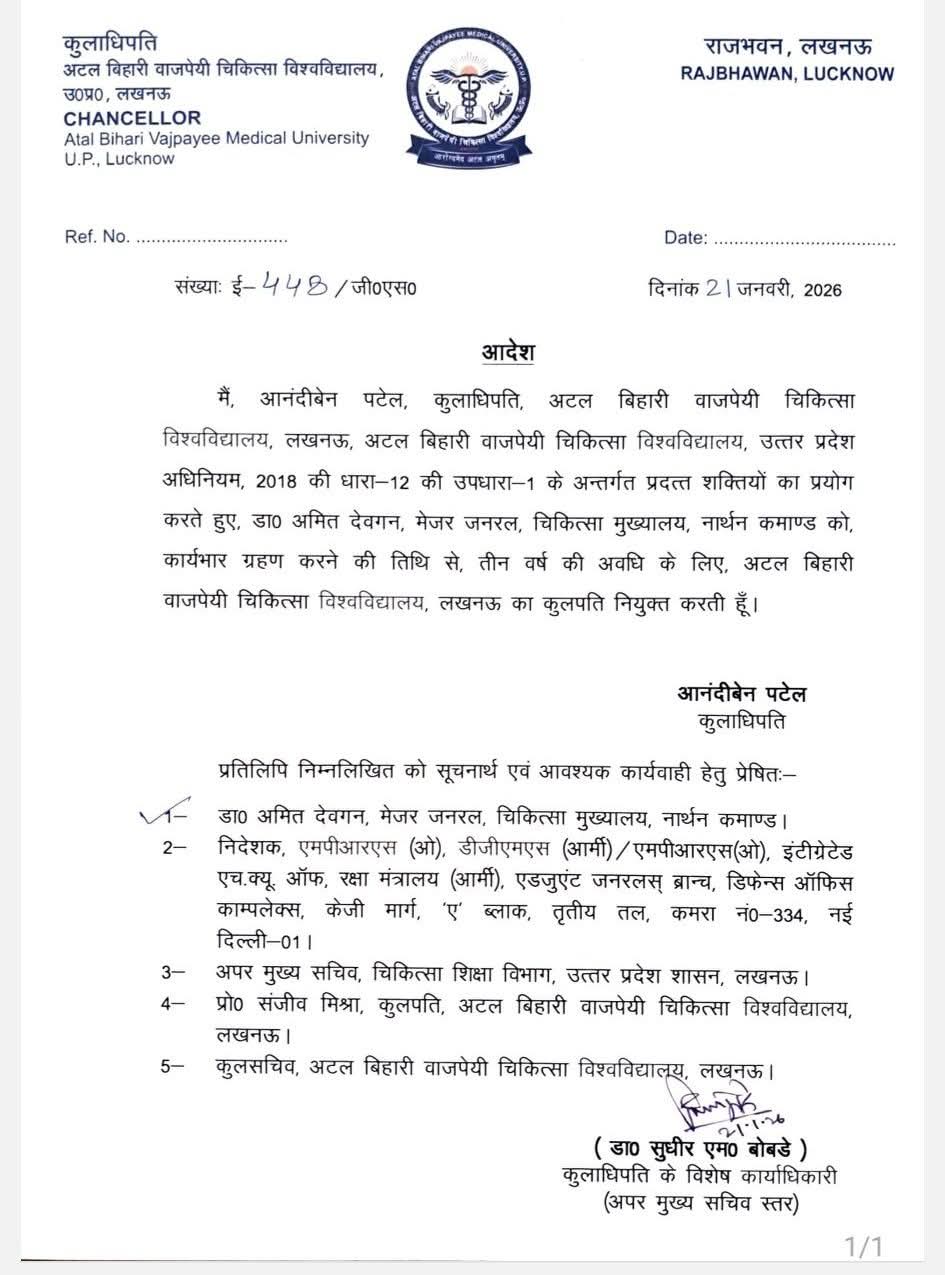 लखनऊ। डॉ. अमित देवगन अटल बिहारी वाजपेई चिकित्सा विश्वविद्यालय लखनऊ के नए कुलपति बनाए गए। राज्यपाल आनंदीबेन पटेल ने जारी किया आदेश।